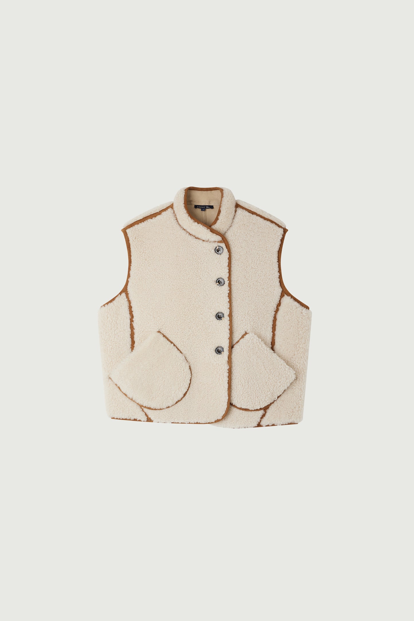 ARNOLD is an oversized shearling vest that you can layer as you please or slip under a loose coat. Its shearling is especially warm. Natural leather straps highlight the round patch pockets, high stand-up collar, and panels that make up the garment.