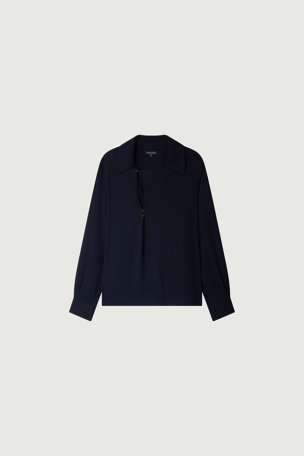 CAMELIA is a blouse crafted from lightweight wool crepe. It is perfect for a chic and refined look, blending comfort and sophistication with an airy, subtly sheer wool crepe fabric.