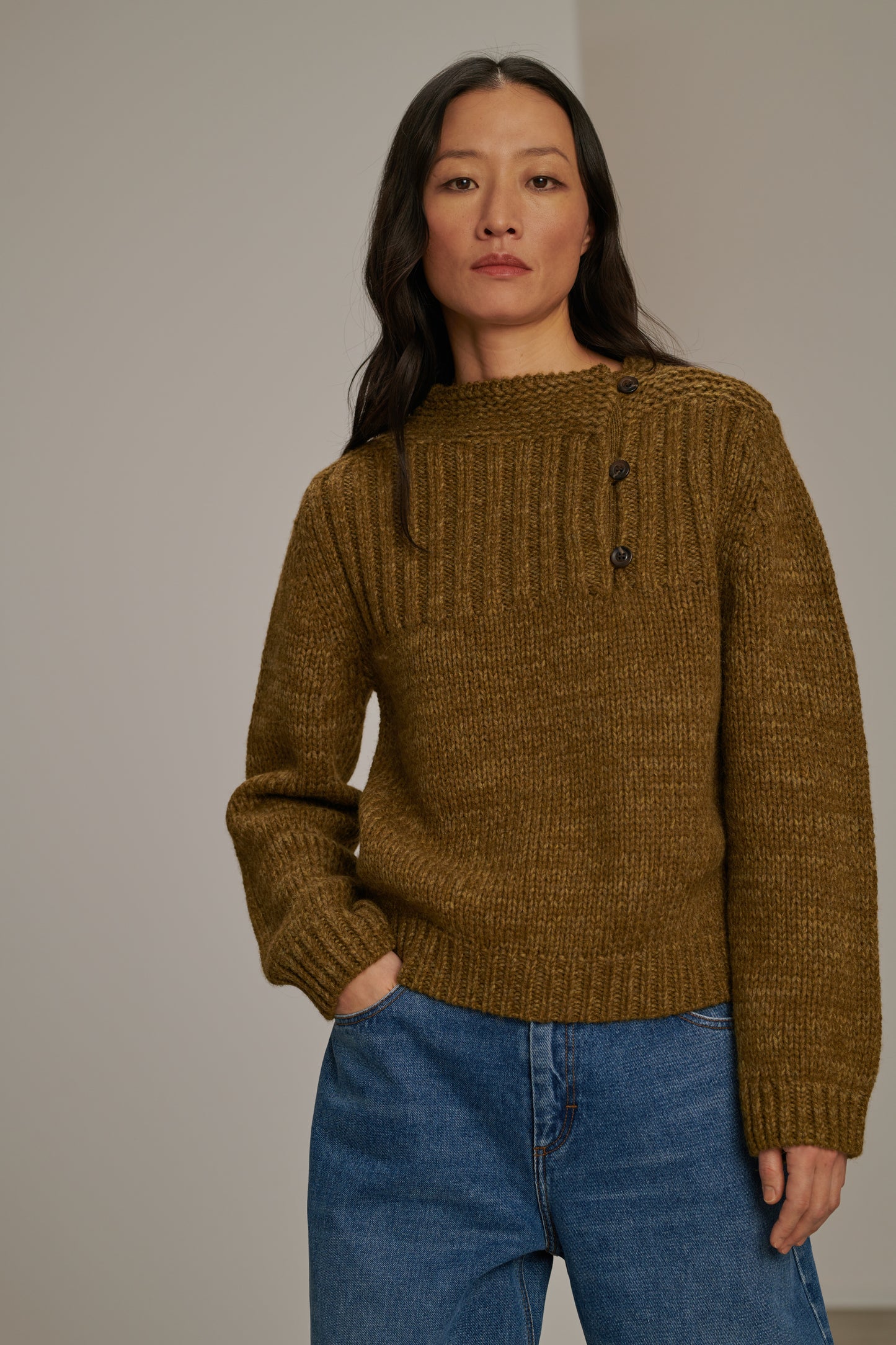 BISCAROSSE is a long-sleeve jumper, knitted from a marled virgin wool yarn. Crafted in a thick yet airy knit, it’s both flexible and comfortable. A buttoned opening at the front allows a side neckline to be revealed. Through a ribbed visual effect, the colour appears marled in shades of khaki and bronze.